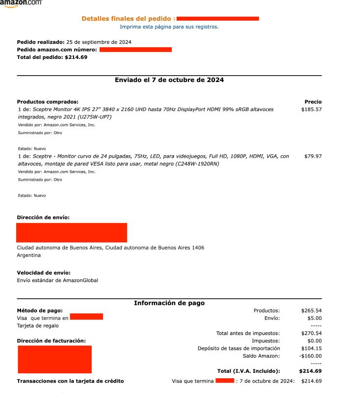Qué mejor que ver la factura… fueron dos monitores comprados el 25 de septiembre. Por algo que desconozco los enviaron recién el 7 de octubre recién. Quizás esperan juntarlos en un mismo lugar si es que estaban separados, porque allá van despachando directo desde donde esté.