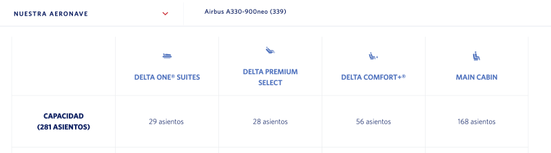 El Airbus 330neo tiene 281 asientos e incluye SUITES en su clase business DELTA ONE.