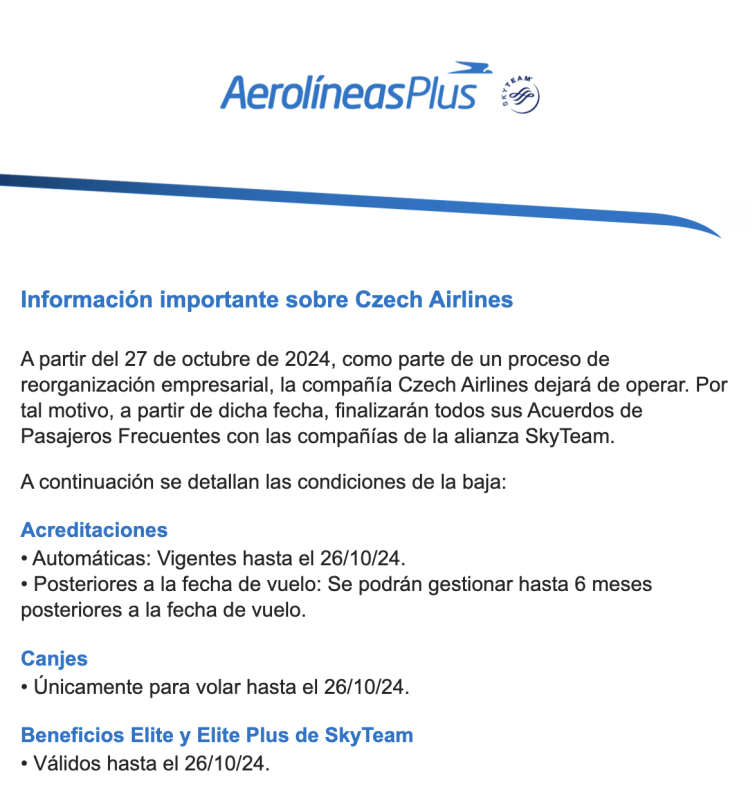 Aerolíneas Argentinas mandó mail hoy a sus socios ARPLUS informando que deja de sumar millas en SKYTEAM aunque claramente con dos aviones no era relevante ya