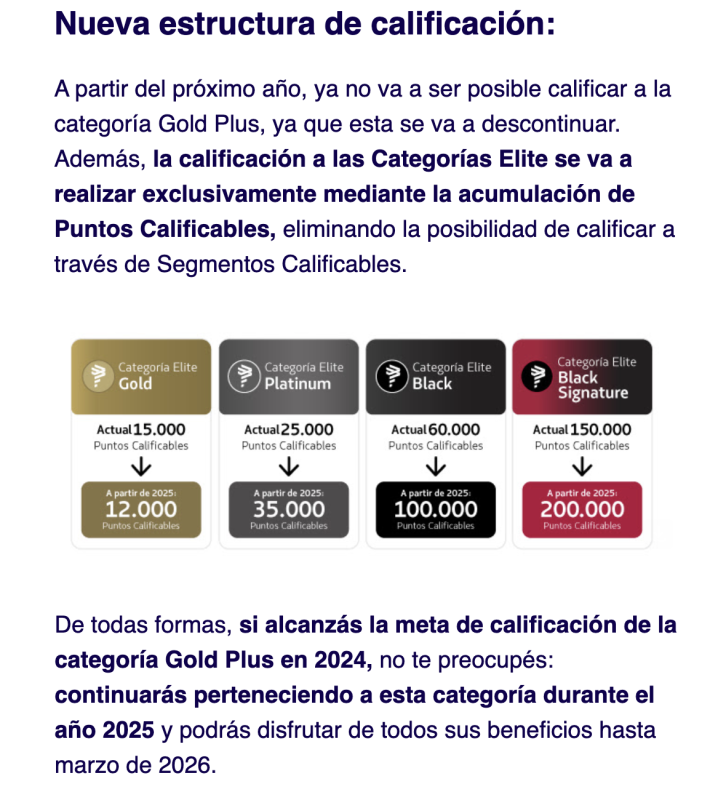 Es muy perjudicial, hablando de puntos calificables, para los que tenemos categoría black o black signature, subieron alrededor del 66% las metas y 50% si viajás con tarifas full, premium y bussines, ni hablar con las tarifas menores. Tengo que repensar que voy a hacer el año próximo con vista al 2026.