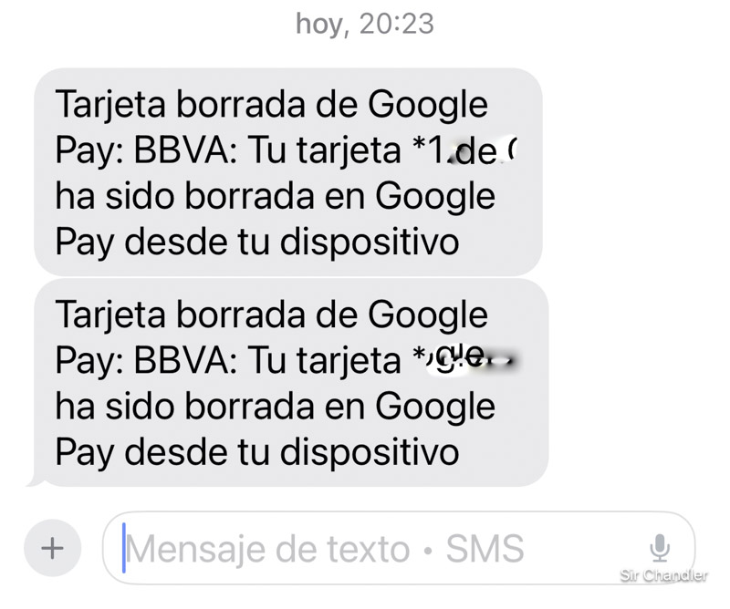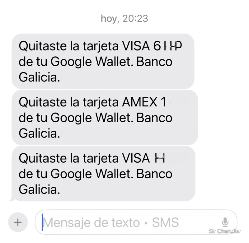 Ayer recibí al mismo tiempo SMS del Banco Galicia y del BBVA informando que yo había sacado las tarjetas VISA de mi Google Wallet