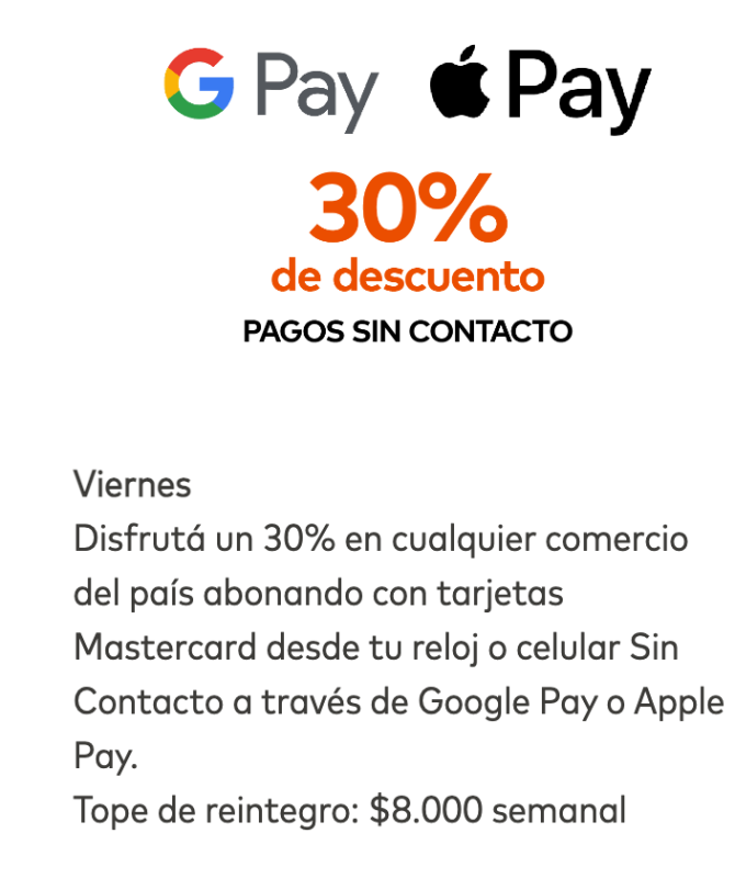 Promoción válida en la República Argentina los días viernes desde las 00hs del 04 de octubre de 2024 hasta las 24hs del 25 de octubre de 2024 o hasta agotar el valor del presupuesto asignado a esta promoción, lo que ocurra primero. Se otorgará la bonificación del 30% (treinta por ciento) con un tope máximo de reintegro por tarjeta y por semana de $8000 (pesos argentinos ocho mil) en las compras realizadas con tarjetas Mastercard emitidas en la República Argentina a través de tecnología NFC (Near Field Communication) mediante un dispositivo móvil (reloj o celular) utilizando las billeteras virtuales de Apple Pay o Google Pay, en todos los comercios de la República Argentina. En el caso de compras con tarjetas de crédito, el descuento podrá visualizarse vía reintegro y se acreditará en la cuenta del titular de la compra en un plazo de hasta 2 (dos) resúmenes de cuenta posteriores a la fecha de realizada la compra. En el caso de compras realizadas con tarjeta de débito o prepaga, el descuento se acreditará dentro de un plazo de hasta 30 (treinta) días hábiles bancarios posteriores a la fecha de la transacción. Quedan excluidas de la promoción las compras llevadas a cabo con tarjetas Mastercard Maestro, las compras realizadas mediante la lectura de códigos QR (Quick Response) y las compras con tarjetas físicas bajo forma de pago chip o mediante pagos Contactless, así como también quedan excluidas las cuentas en mora y/o bloqueadas por motivos administrativos. La promoción será válida para consumo personal y se deberá consultar con el banco emisor la eventual aplicación de cargos por comprar en cuotas.