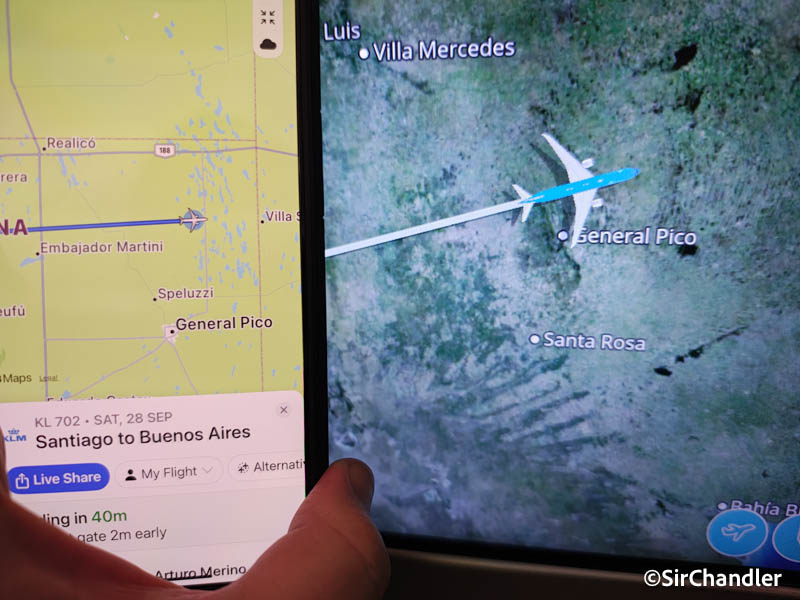 Otra cosa que anda bien en Flighty, es que sigue al avión con datos precisos sin DATOS pero conectados a los servicios gratuitos de mensajería. Eso con la versión premium. Entonces acá se ve con el celu a la izquierda y la pantalla del avión a la derecha, que daba la ubicación precisa lateral a General Pico, La Pampa
