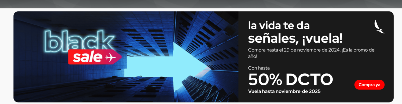 Avianca igualmente promueve su BLACK SALE (no hay algo oficial de BLACK FRIDAY como no lo hay de NAVIDAD) y habla de vuelos hasta noviembre 2025