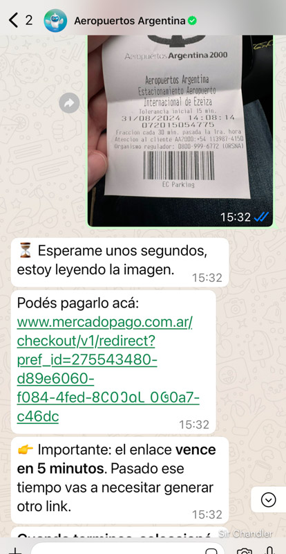 Yo hice el pago por WhatsApp y no fué ninguna boludes. Es medio engorroso. Y después de hacerlo, no me reconocía el pago y me tuvieron que validar la salida manualmente. Una cagada ese sistema. La próxima pruebo pagar en las máquinas a ver si es más rápido.
