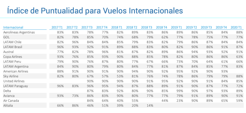 También se medía la de los vuelos internacionales. En ese único trimestre de 2020 las mejores eran Austral y Avianca y la peor Air Canada que seguro era afectada por su vuelo con Chile