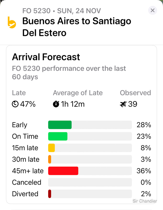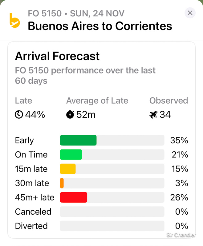 En el caso de Flybondi agarré también uno de ayer a Santiago del Estero. Al menos la mitad… salió en horario o adelantado. Incluso da el promedio de tiempo de los demorados