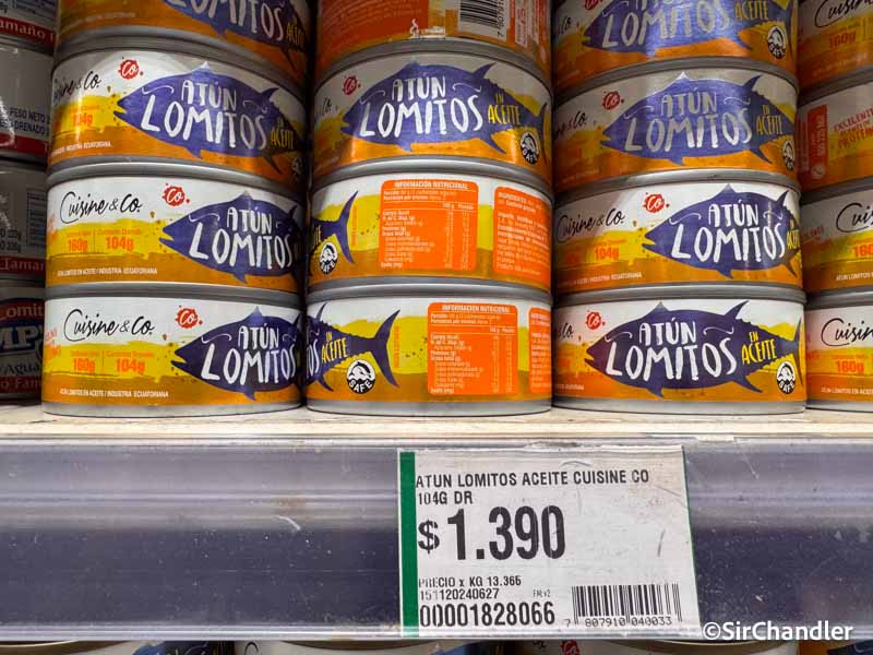 En un momento se dijo que estábamos «1 a 1» con el peso chileno, pero la realidad es que eso puede confundir. Eso está más cerca de ser en dólares cambiando el punto por una coma. O sea algo así hoy como USD 1,40. Pero el atún siempre sirve para tomar de referencia, más cuando la misma marca Cencosud la vende de este lado…