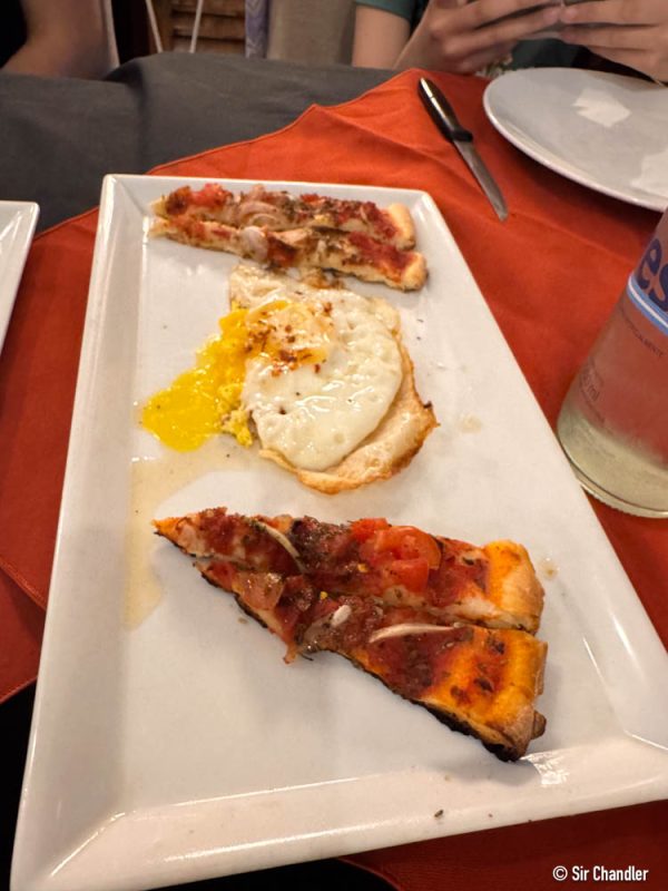 Ahora están más en el centro, pero siguen con lo de siempre. Por ejemplo de servicio de mesa te traen uno o dos huevos fritos DE CAMPO (depende de los que sean) y pizza de cancha… buena masa, buena salsa. Y con esto demuestran su materia prima que es muy buena