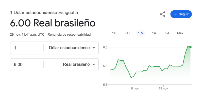 Hoy es el Black Friday pero ayer jueves fue noticia Brasil por una devaluación del REAL en relación al dólar. Igualmente si vemos las cifras reales se aceleró un poquito y no es que fue una de las devaluetas a la cuales siempre estuvimos acostumbrados. Acá se ve el gráfico de la evolución del cambio con la variación del último mes