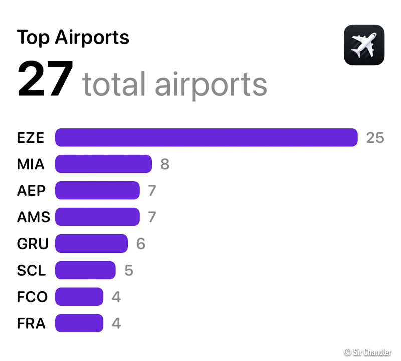 Los 27 aeropuertos pisados, liderando Ezeiza. Luego Miami por conexiones mayormente, Aeroparque y Amsterdam! que pisé varias veces