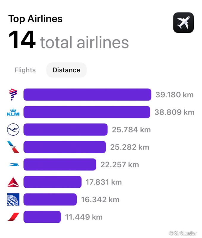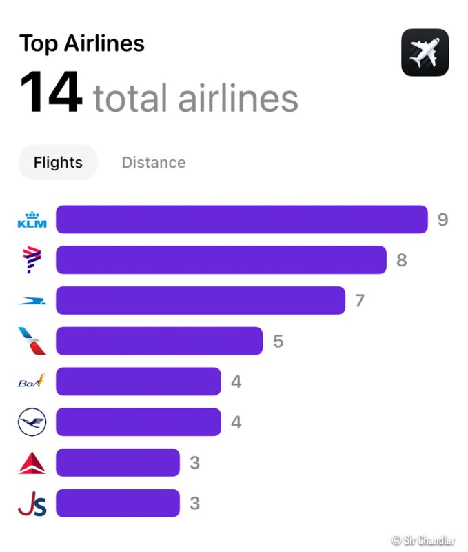 La aerolínea con la que más veces volé fue KLM… viaje de prensa de Chequia a Praga, final de la Champions en Londres y viaje de prensa a Santiago de Chile. Segunda Latam, tercera Aerolíneas y cuarta American. En el quinto empate entre BOA y Lufthansa. Cierran Delta y Jetsmart