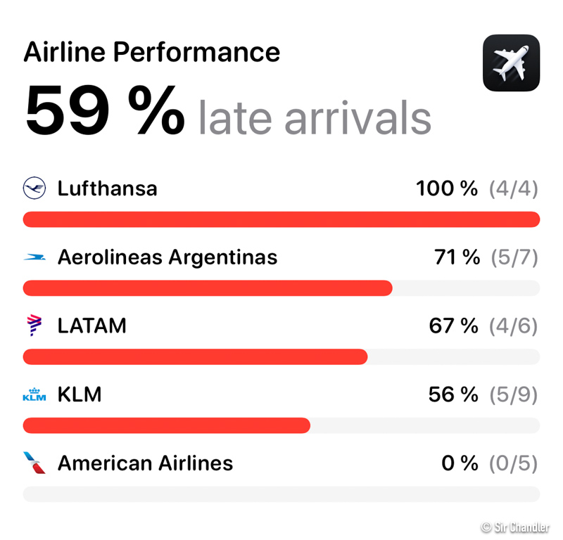 Y acá lo curioso… y lo que no le gustaría ver a una aerolínea, pero es técnico, es dato. Los 4 vuelos de Lufthansa llegaron tarde. 5 de 7 de Aerolíneas también y 4 de los 6 de Latam también se afectaron. KLM cierra con 5 de 9. Pero de nuevo, esto es si llegaron DOS MINUTOS tarde lo marca