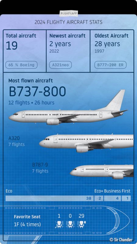 Va un repaso estadístico de todos los vuelos que hice en este 2024. El mapa de arriba es de Flightradar24 pero usé la info que da la app Flighty que tengo en el iphone y ojalá aceleren su llegada a Android porque realmente es muy buena. Aclaro que tengo la versión paga, pero la gratuita sirve para seguir los vuelos que uno tiene o de amigos de muy buena manera.