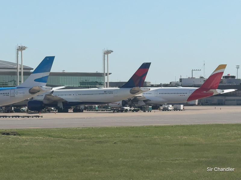 Pero si todo sale bien en los días normales, no deberían estar los tres aviones en la plataforma porque uno, el primero que llegó en el Airbus 330 «normal» debería irse antes del aterrizaje del neoyorkino