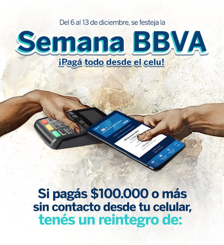 Esta promoción te permite obtener por única vez $25.000 de reintegro realizando compras por un total de $100.000 o más con tus tarjetas de crédito BBVA Visa y/o Mastercard a través de Apple Pay (disponible sólo en IOS) Google Pay, Modo Contactless o App BBVA sin contacto. Suman las compras de las tarjetas titulares y también adicionales.