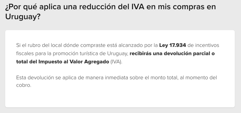 A mi lo que me interesaba saber era sobre la DEVOLUCION DEL IVA que hay en Uruguay con las tarjetas extranjeras, ya que por ahí era algo que no lo tenían resuelto pero OH MILAGRO una de las tres preguntas en la sección ayuda es sobre este tema!