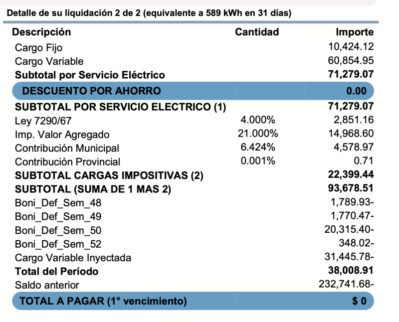 Pero dejo mi factura a no pagar en enero… donde se ve que normalmente hubiera sido de 93.678,51 pero había que descontar 31.445,78 de INYECCION a la red… pero tengo tantas bonificaciones por servicio deficitario más la multa grande por lo de diciembre de 2023 que aun sigue llegando, que mi factura es negativa…