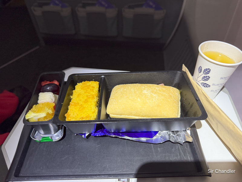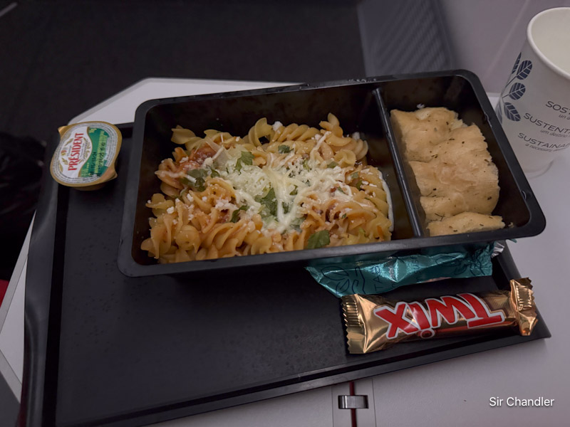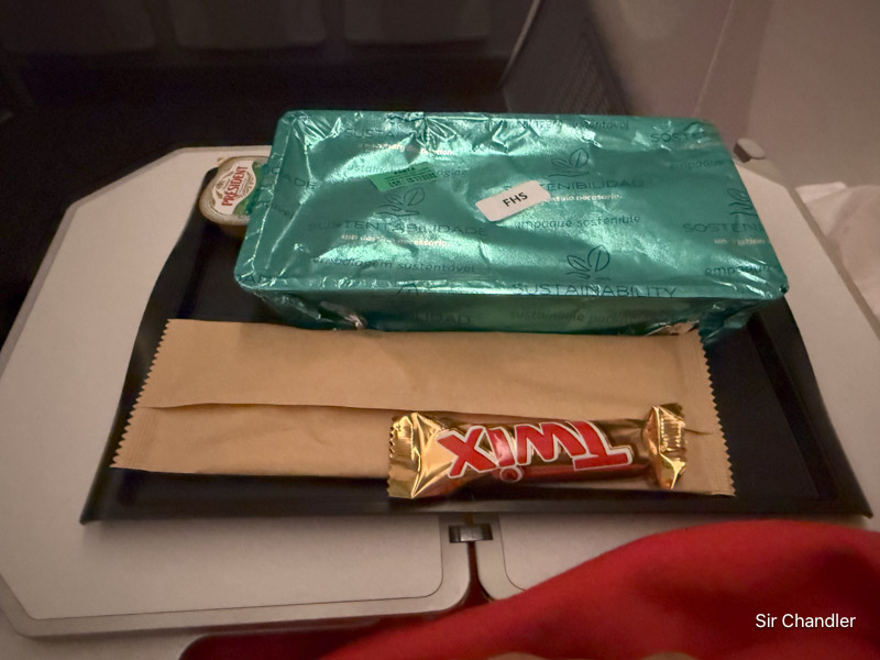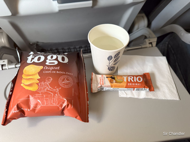 El servicio en el vuelo con unas papitas y una barrita. A falta de TÉ NEGRO que los brasileños no toman… agua