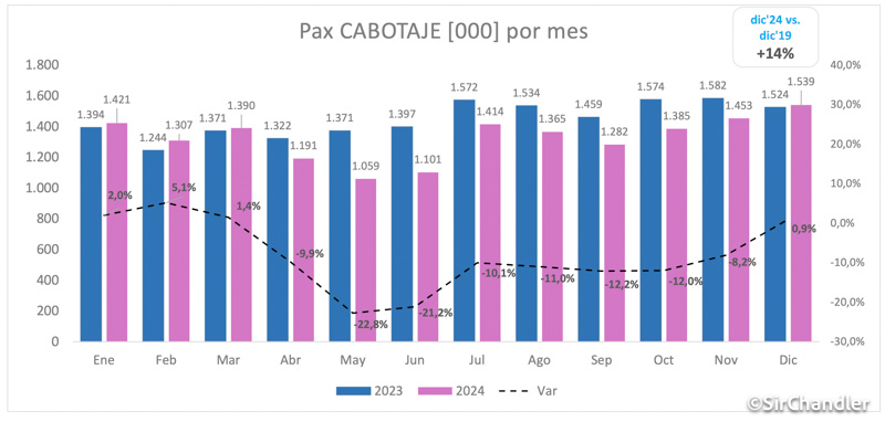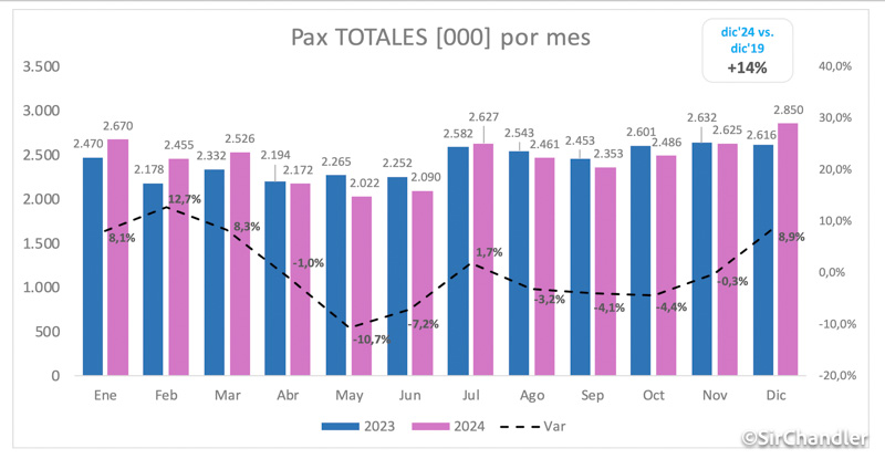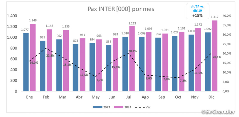 Pasajeros totales de diciembre 2024 terminaron siendo un 14% más que el mismo mes del año pasado. Pero como referencia en enero 2019 hubo unos 27.000 más y esa es la marca a superar seguro. Todo hace imaginar que el crecimiento en internacional este mes hará que se supere esa marca, veremos como queda cabotaje y si el número final es el mejor de la historia.