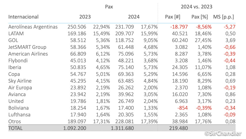 Acá también vemos como Aerolíneas perdió pasajeros con un 8,5% menos y eso son 5 puntos menos de participación. La que creció un montón es GOL con 27% más de pasajeros y 3,6 puntos. En crecimiento de pasajeros totales sigue Latam y en participación sigue Iberia. Todas las que crecieron fue por más vuelos. Curioso que Jetsmart y Flybondi hayan perdido, estimo por poner más foco en cabotaje