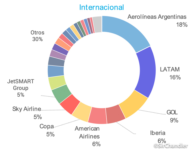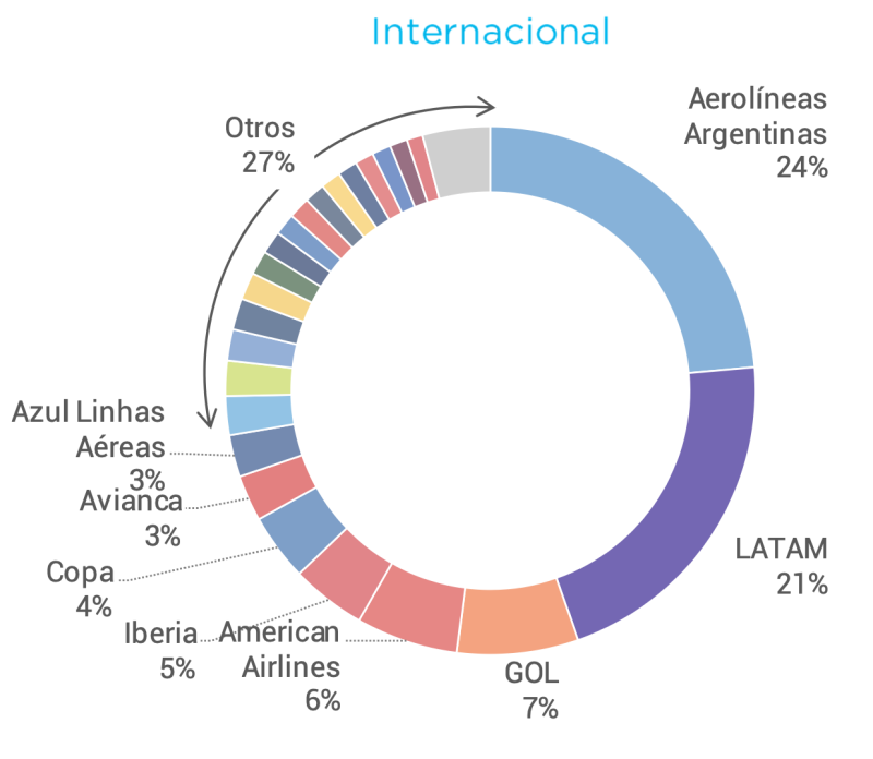 La torta de participación internacional general sigue teniendo a Aerolíneas Argentinas primera con el 18% seguida por Latam con el 16%