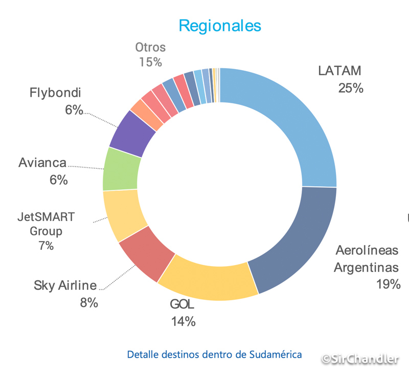 En regionales el peso de LATAM es muy fuerte teniendo uno de cada 4 pasajeros y se ve a Gol también poderosa.