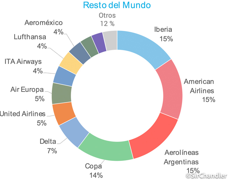 En resto del mundo ya no pisa Latam y hay triple empate entre Iberia, American y Aerolíneas, con COPA pisando los talones