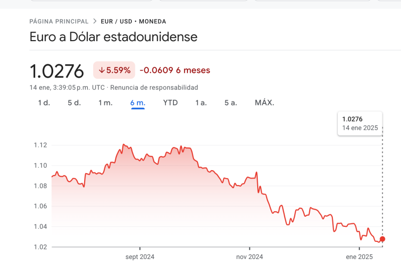 El Euro hoy llegó a costar. 1,03 dólares, siendo una cifra realmente baja como se puede ver en este cuadro de google con la evolución de los últimos 6 meses, teniendo el valor más bajo en todo este tiempo