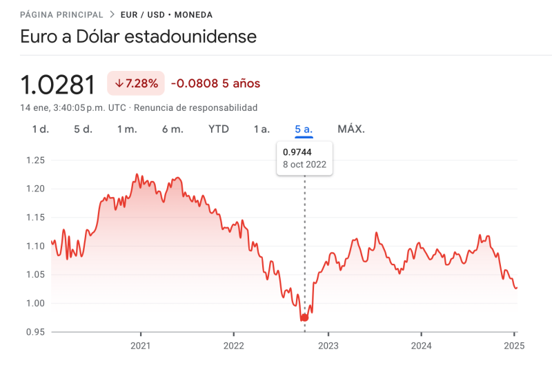 Igualmente no es lo más bajo, porque en el 2022 llegó el «uno a uno» y también hasta unos días el dolar valió más que el euro en si como se ve el 8 de octubre de 2022