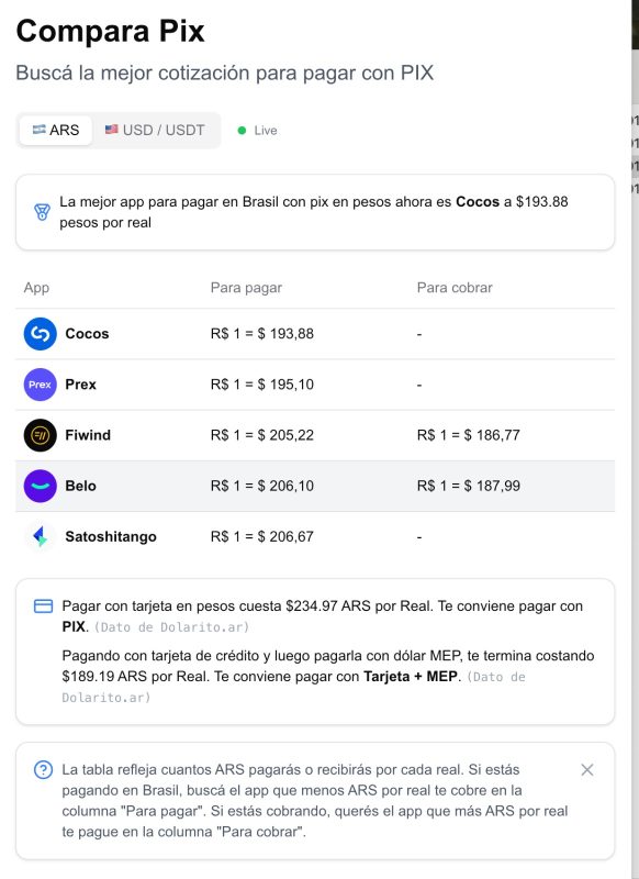 Un desarrollador argentino hizo un sitio que se llama Compara Pix y muestra los valores actualizados de cada una de las billeteras y la comparación con el dólar TARJETA (el peor) y el costo de pagar el resumen con el dólar MEP (la manera más neuronal de todas)