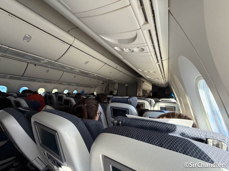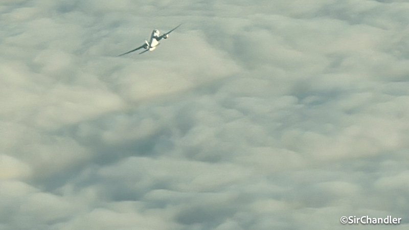 Se lo nota cansado al interior del 787, sobre todo al tapizado de esos asientos. Ese «polarizado» que se ve en las pantallas en realidad indica lo viejas que son; éstas son las IPS, hoy obsoletas y muy superadas con la tecnología actual. Hermoso colchón de nubes sobre cielo británico eh! como para que no sean pálidos…