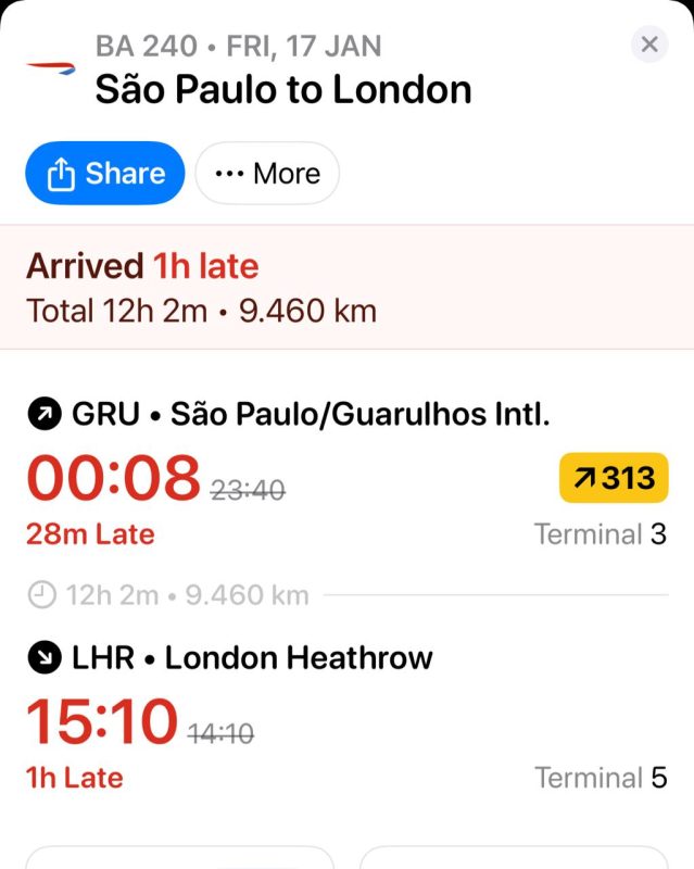 El vuelo terminó cerrando puertas tarde. Acá flighty muestra 28 minutos de demora pero un arribo de una hora tarde. Esto es por la demora luego en la pista de Guarulhos y la aproximación en Heathrow, lo que nos hizo correr un poco en la conexión, pero lo mostraré en el siguiente post de vuelo
