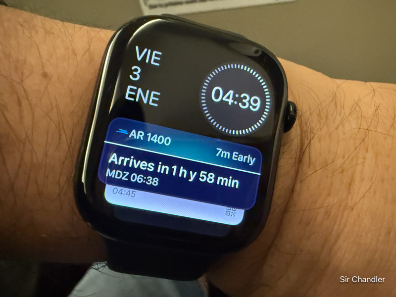 APP Flighty en con su widget en el reloj de Apple informando que el vuelo estaba adelantado 7 minutos en su salida.