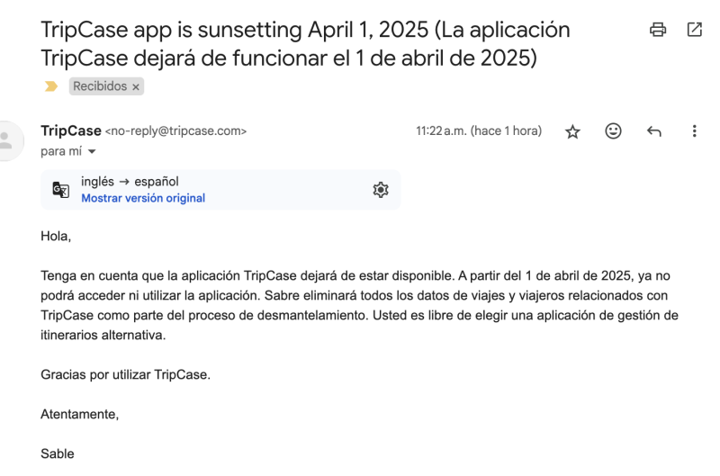 TRIPCASE, la aplicación de viajes que más he usado en todos estos años, dejará de funcionar en abril, según informó SABRE (su propietaria) a los usuarios hace un rato por mail.