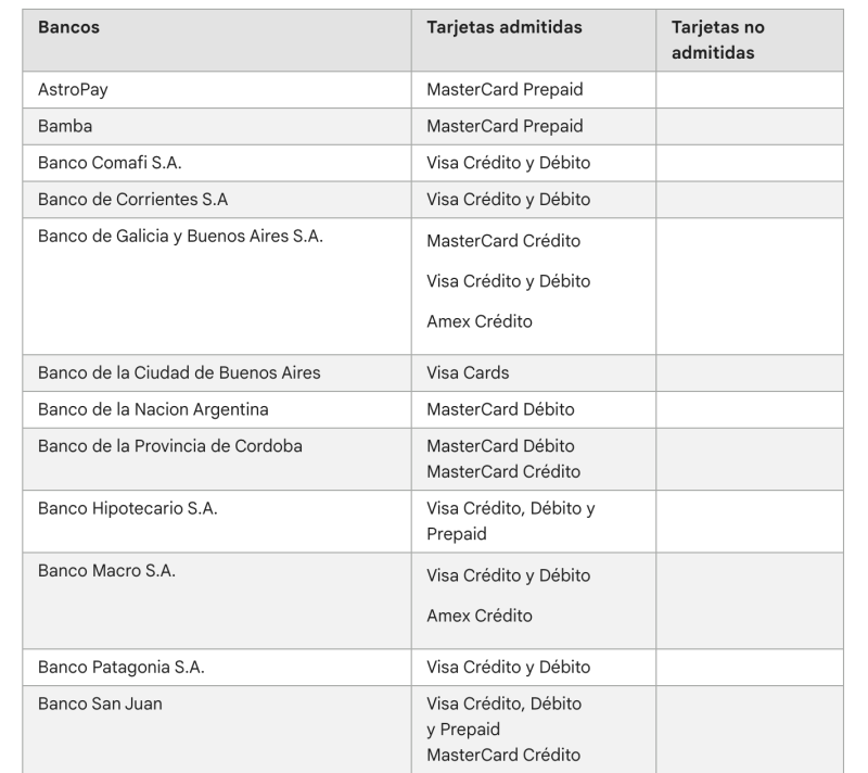 Hola Banco Patagonia también admite (ademas de VISA Crédito y Débito), Mastercard y American Express. BAPRO, como siempre NADA.Saludos