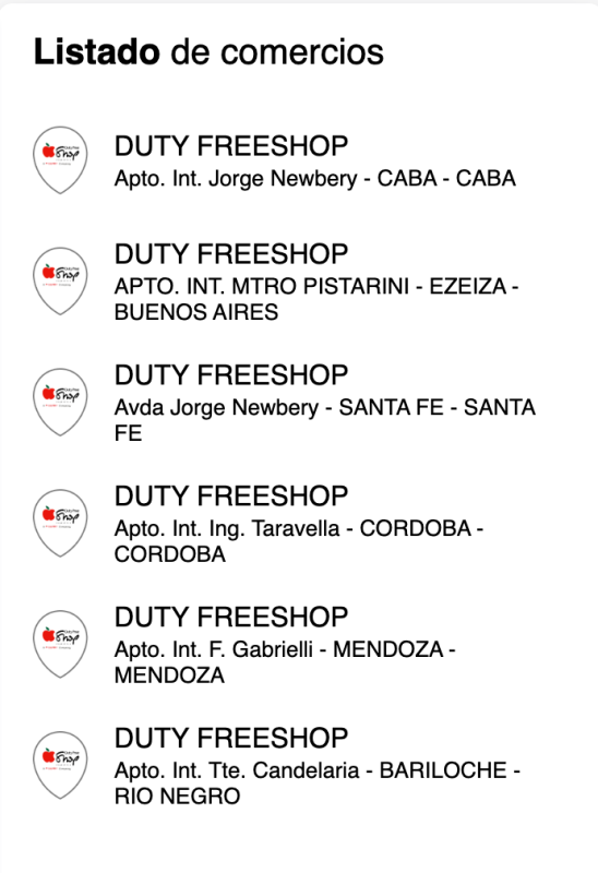 Free shops de aeropuertos, no todos los del país, porque el de Puerto Iguazú no lo tiene, seguramente porque son otros propietarios.