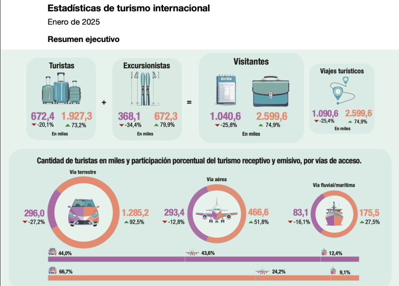 Aywr el INDEC dio a conocer cifras del turismo en el mes de enero en cuanto al movimiento de personas residentes y no residentes, cuantos que viven acá (argentinos y no) salieron y cuantos (argentinos y no) vinieron de visita al país. También los medios de transporte.