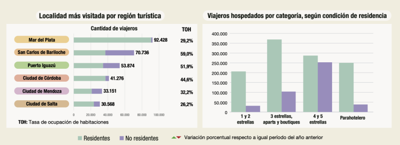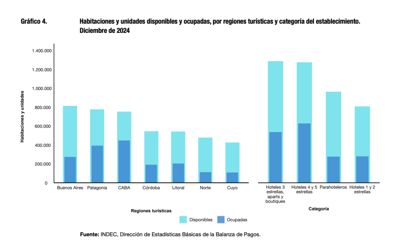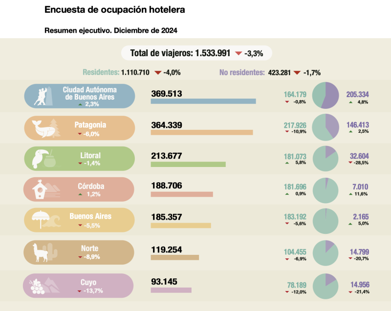 Esta es la parte de hoteles donde indica una baja con respecto a un año atrás pero es DICIEMBRE y la caída fue de solo 3,3%. Es interesante ver como Córdoba o Buenos Aires (provincia) tienen poca participación de no residentes en el país siendo que Ciudad de Buenos Aires más de la mitad no viven en la Argentina