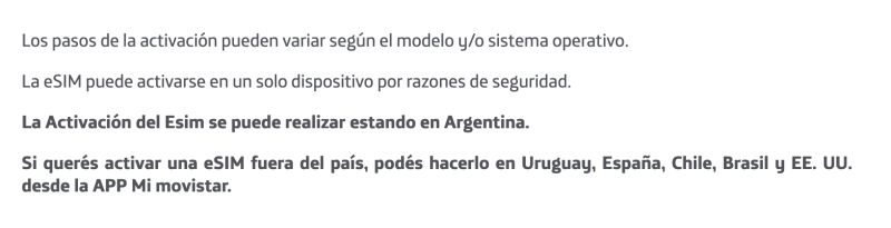 Eso es para pedir el ESIM y/o activarlo. Después activar la línea es otro tema. Y Movistar lo que no pernitia y al día de hoy sigue aclarando en las preguntas frecuentes es activarlo vía Roaming. No sé si es un tema técnico o de seguridad que ellos consideran pero bueno. A tener en cuenta que una cosa es tener el QR y otro que levante señal active la línea y demás en exterior, vi que otro usuario comentó que no lo pudo hacer esto mismo con claro.