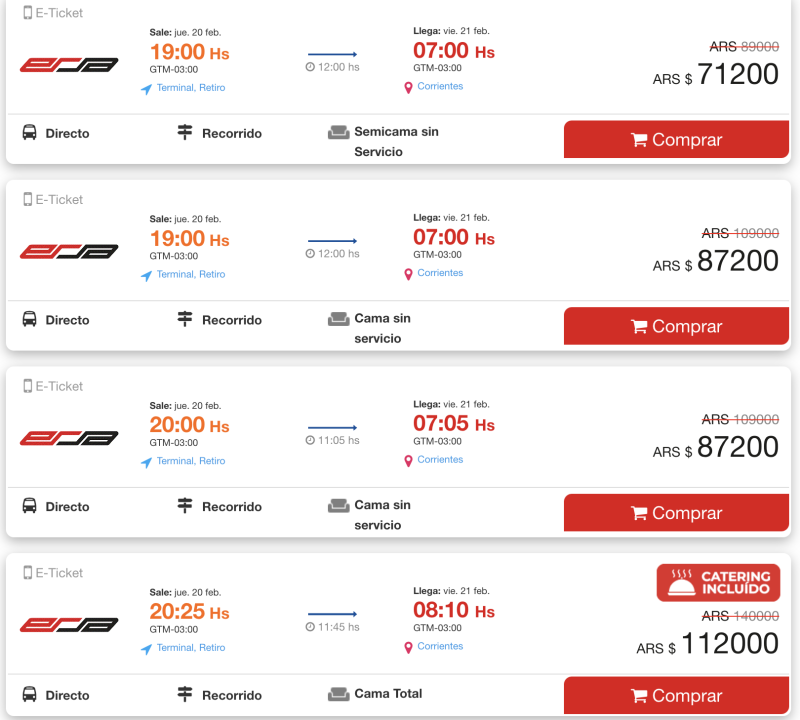 Entonces fui a buscar a su sitio el costo del servicio. Podemos ver que entre Retiro y Corrientes hay semi cama a 71.200, pero el cama cuesta $10.000 más.