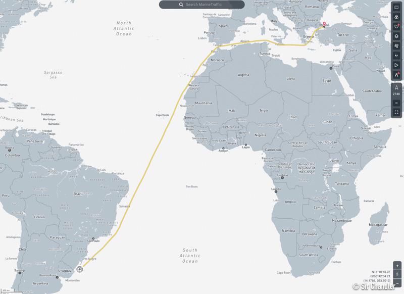 Hoy esta en el medio medio del atlantico, a unos 400 km de la costa de Guinea navegando a 7 nudos por hora que equivalen a poco mas de 12 km. Marine Traffic dice que ahora va a llegar el 26 de abril.
