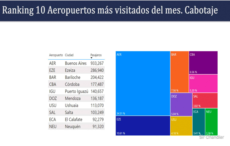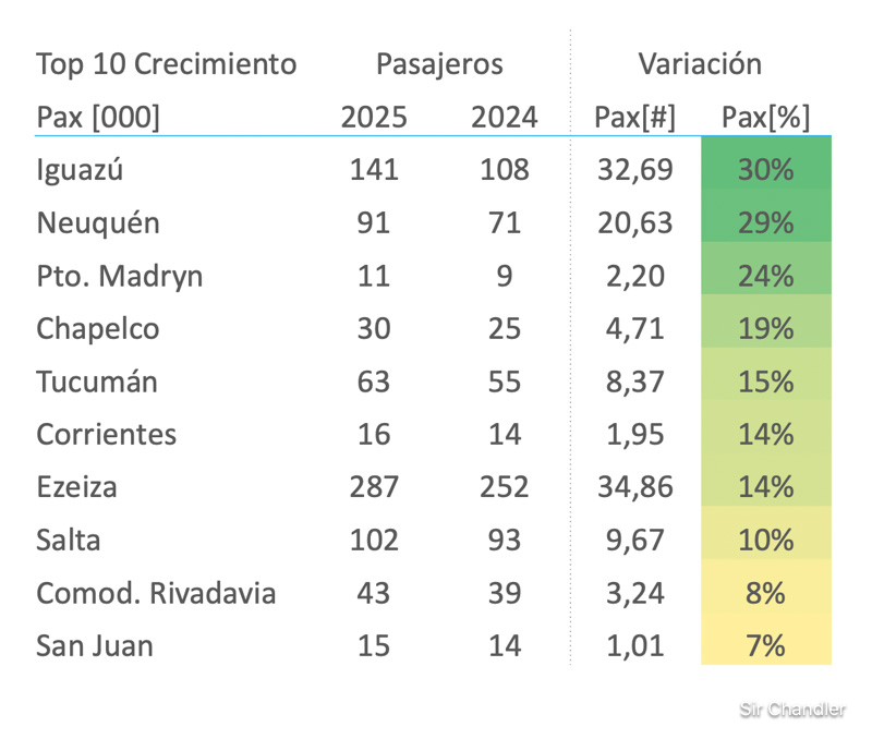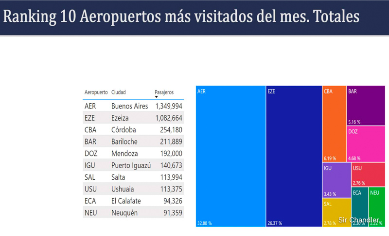 Este mes es bueno ver los cambios en los aeropuertos nacionales con los pasajeros, porque hay meses donde aparece primero uno que previamente estuvo cerrado y no sirve. O sea acá si el crecimiento de Iguazú es claro, seguido por Neuquén y Puerto Madryn. Incluso Ezeiza mejoró en pasajeros de cabotaje. San Juan mejoró seguramente por los vuelos de Flybondi y estimo un aumento de Aerolíneas Argentinas