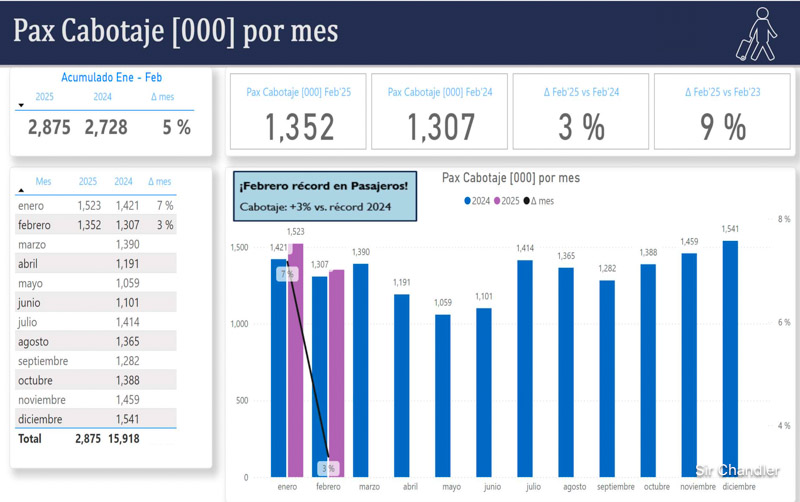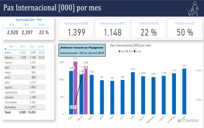 Pasajeros internacionales de este febrero 2025 son 1.399.000 contra 1.148.000 del año pasado. La mejora fue del 21,9%, lo cual es un montón. En el cuadro comparan contra febrero 2023 y marca una mejora del 50%. En mis archivos la comparación contra febrero 2019 indica una mejora del 6,5% y también el reporte marca que el mejor mes de la historia fue febrero 2018 y la mejora fue del 2%