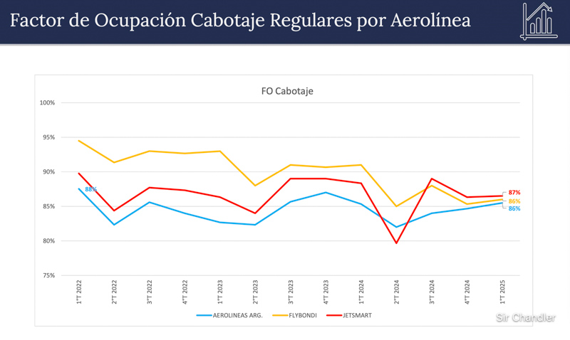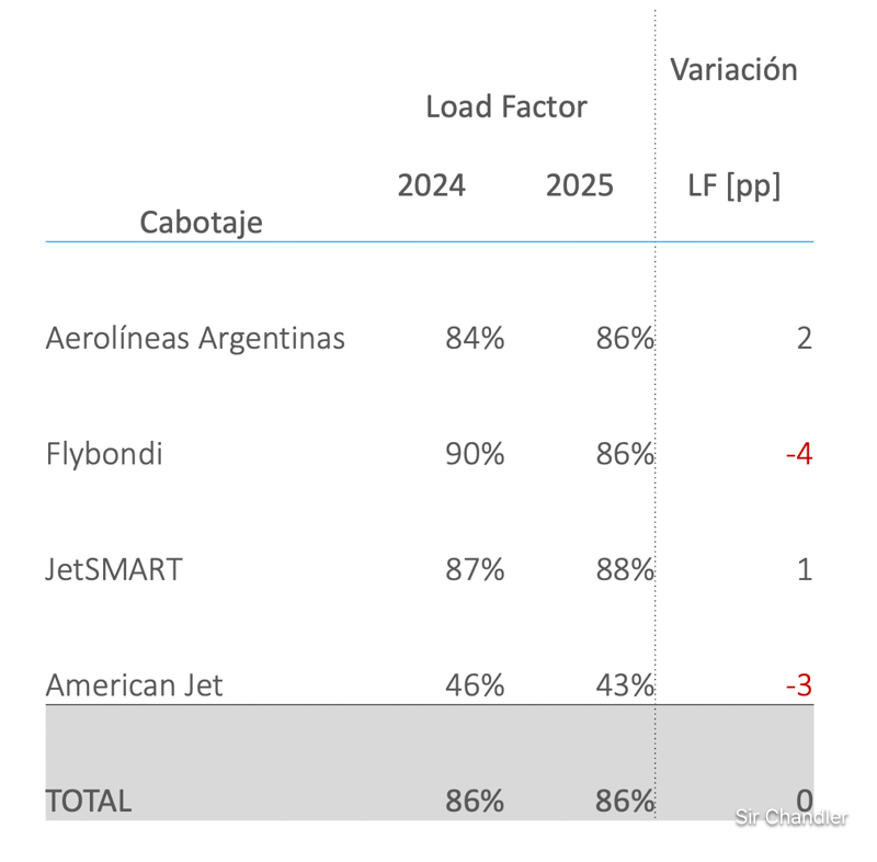 Acá se ve mejor que Flybondi perdió cuatro puntos en ocupación mientras que Aerolíneas mejoró dos y Jetsmart uno.