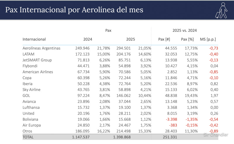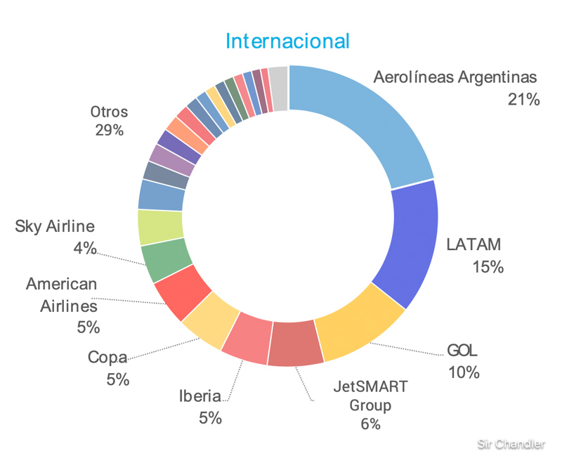 Aerolíneas Argentinas liderando la participación internacional con el 21 seguido por Latam con el 15 y GOL con el 10. Jetsmart (con todas las filiales) los sigue con el 6 para. luego tener un empate entre American, Copa e Iberia con el 5.