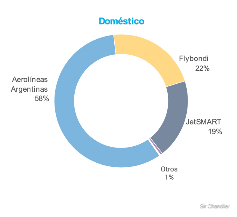 Aerolíneas Argentinas tuvo menos pasajeros en cabotaje (pero gana en internacional). Eso le llevó a perder 10 puntos de la torta. Jetsmart ganó 8 puntos y Flybondi uno