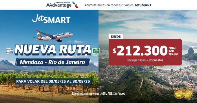 Mendoza, 6 de marzo de 2025. JetSMART, la aerolínea ultra low cost con la flota de aviones más moderna de Sudamérica, anuncia la apertura de su segunda ruta internacional directa desde la provincia de Mendoza. A partir del próximo 9 de mayo, la compañía operará vuelos directos entre el Aeropuerto Internacional El Plumerillo y el Aeropuerto Internacional de Río de Janeiro, convirtiéndose en la única línea aérea con vuelos directos entre ambos destinos.