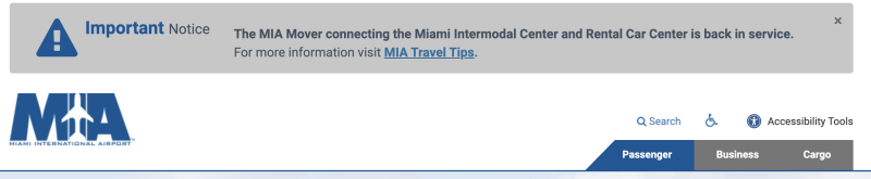 El MIA Mover, que conecta el Centro Intermodal de Miami (MIC) con el MIA, volvió a funcionar el 22 de marzo tras someterse a mantenimiento para garantizar la seguridad y eficiencia del sistema. Los usuarios de autos de alquiler y del transporte público pueden volver a conectarse al MIC con el MIA Mover. Las opciones alternativas de transporte terrestre incluyen viajes compartidos y taxis.