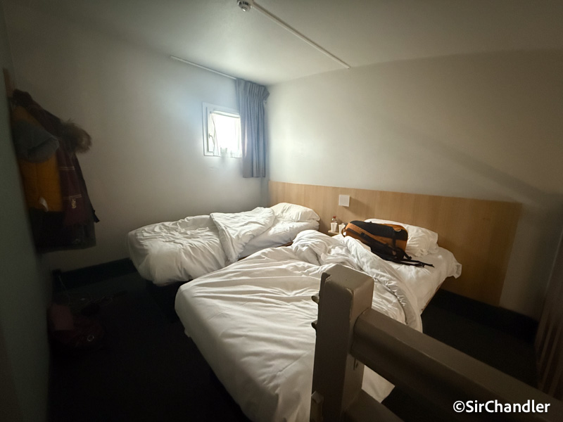 Y en la planta baja (aunque la habitación estaba en el segundo piso del edificio) estaba nuestra cama, con poco espacio en general, pero cumplió el hotel con lo que buscábamos… estar unas 12 horas, ducharnos, dormir y desayunar.